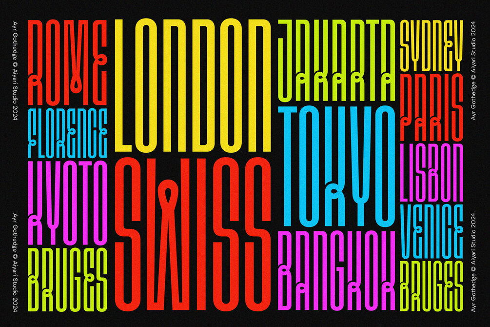 Introducing Gothedge, a striking typeface that seamlessly blends the elegance of clean, streamlined letterforms with the playful and experimental spirit of the Art Nouveau era. Its ultra-condensed, tall letterforms feature unique curving details, making Gothedge is the ideal choice for those seeking a balance between refined elegance and avant-garde creativity.
