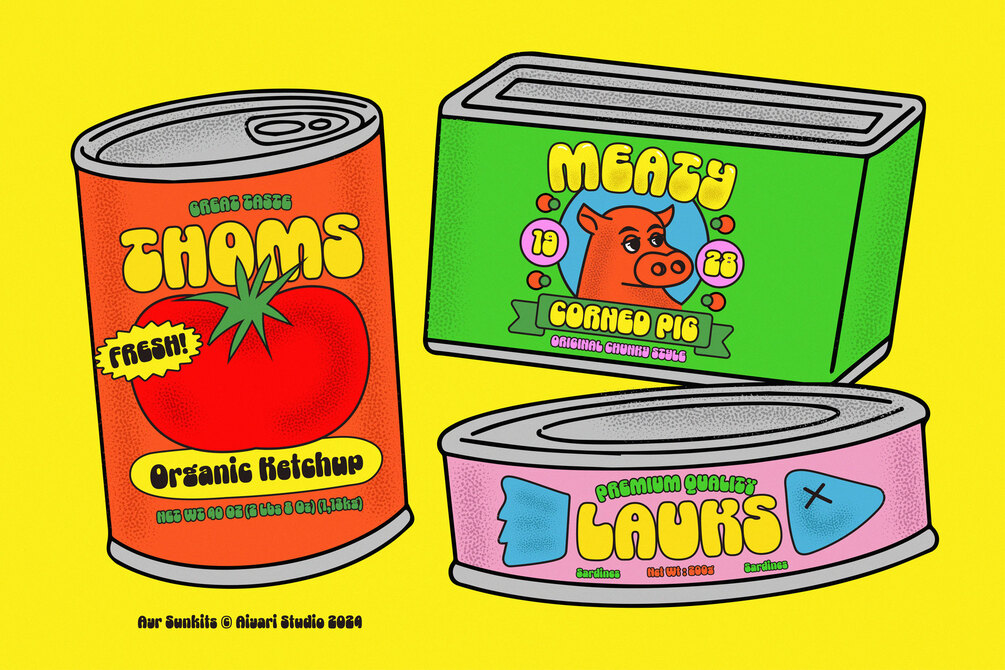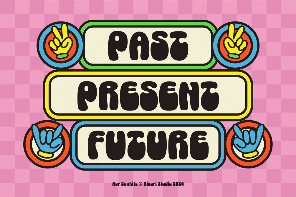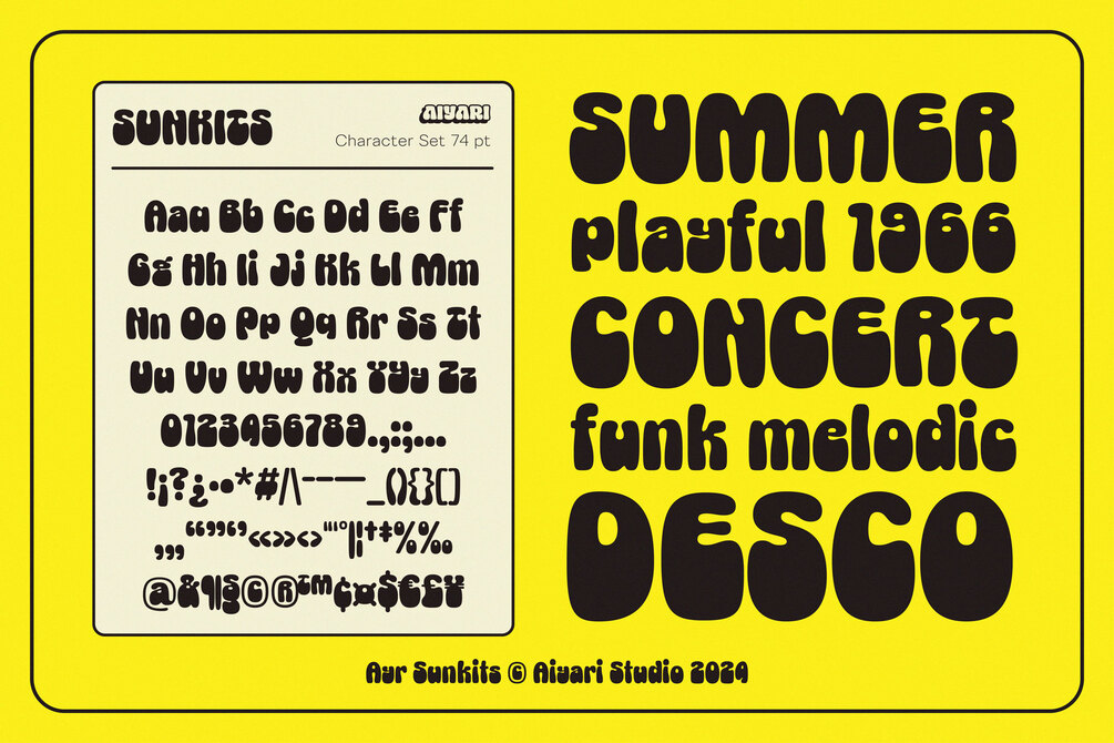 Introducing Sunkits a typeface heavy influenced by hobo typeface infused with bubble vintage letter form with psychedelic design approach. Ayr Sunkits encompasses everything you need to complete your creative projects with modern groovy approach.