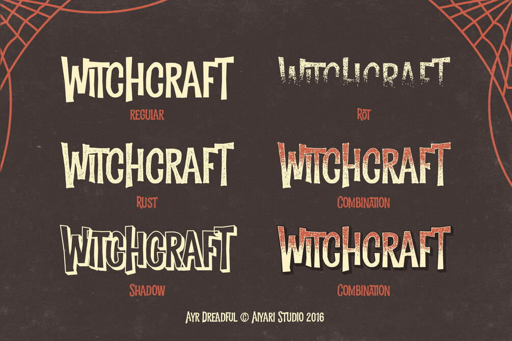 5 Otf Files (Ayr Dreadful Regular, Ayr Dreadful Shadow, Dreadful Rot, Dreadful Rust, Ayr Dreadful Extras) ; 5 Woff Files (Ayr Dreadful Regular, Ayr Dreadful Shadow, Dreadful Rot, Dreadful Rust, Ayr Dreadful Extras) ;